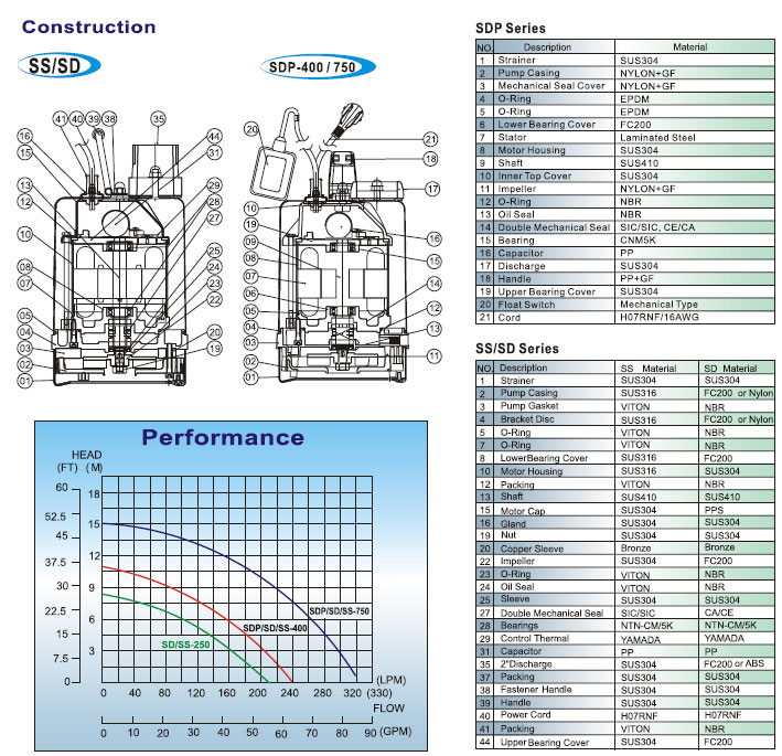| SD-400 | 1/2 HP / 400W | 50mm / 2" | 7M / 140 LPM | 11M / 240 LPM | 181 x 181 x 340mm | 12 kg |