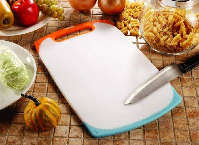 PP CUTTINGBAORD IN WHITE AND BOTH EDGES COVERED WITH DIFFERENT COLORS TPR RUBBER.