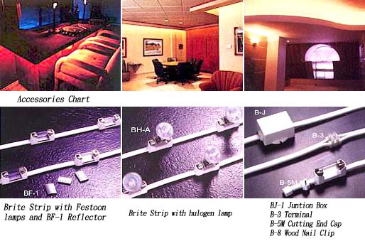 Brite Strip has a flat cable-like body can be mounted with wood nail clip or surface installed by its attached adhesive tape. It is also interchangeable in the light source from festoon bulb to halogen lamp with adapter, bringing you a perfect blend of design flexibility and quality illumination.