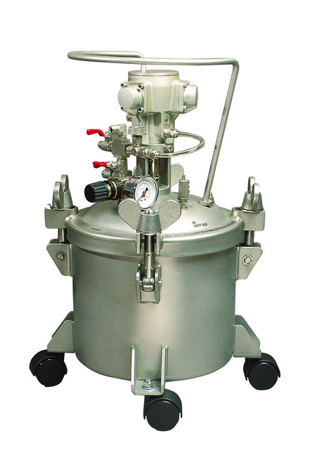 1. Pot body is one-piece formed of high-quality Stainless Steel. 2. Capacity 10 litre 3. Max. working pressure : 4.1 Bar / 60 PSI 4. Top fluid outlets 5. Pressure tanks is equipped with air agitator 6. Agitator blade is made of stainless steel. Applied for : 1. Waterborne fluids like paints, adhesives, etc. 2. Glue 3. High-viscosity fluids. 4. Acid fluids, alkaline fluids and other chemical fluids. 5. General paints adding with solvent.