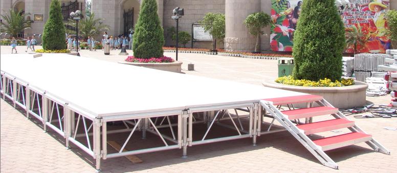 The complete system, including stage board, stage frame, stage brace and other accessories called aluminium stage show. The stage show is the most versatile staging and strongest system in the market. Our stage is constructed without any tools, just our hand, it is very easy. And compared with the steel stage it is more beatifull and more light, compared with the transparent stage, it is more cheaper, so it is more popular on the market.