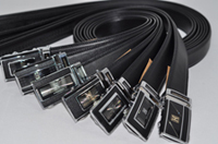 The belt material is split cow and the buckle material is zinc alloy, length between 1.1m to1.4 m, width between 3.5cm to 4.0cm, the color including black, white, red , blown; country of origin: made in China; the products is high quality and reasonable price
