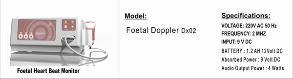 Our range of digital foetal heart beat monitors, works on the principle of Doppler's effect. We have incorporated a very low intensity ultrasonic frequency of 2 MHZ beamed into the body from a probe and it is reflected back from the organs and blood particles. Further, the frequency of reflected signal is changed slightly due to movement of foetal heart blood particles and other moving organs. Then the reflected signal received by the instrument is amplified and processed electronically to get audible signal through built in speaker or external earphone