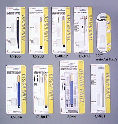 The design knife provides you a precision cutting in artwork, model, hobbies, D.I.Y....etc. With two kinds of handle material, stainless steel and plastic. Easy holding and control. About the hobby knife set, includes three different knives for use on light and heavyweight materials, EX. paper, balsa, cloth, acetate, wood, plastics, film, matboard and carboard. All knives have positive grip handles. Moreover, with ten replaceable blades and unlimited cutting capability.