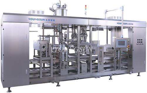 YSZB Youngsun Automatic Plastic(Paper) Cup Filling and Sealing Machine is suitable for packing cup of yogurt, milk, cheese, drink, water and so on. Capacity can reach 6000-20000 cups/hour. The working process includes: cup falling, no cup detect, dust elimination, filling, film covering, data printing, heat sealing, cutting, output.