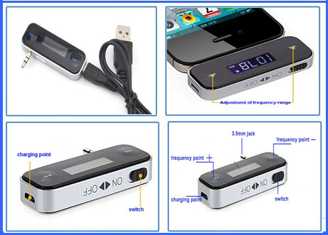1.FM Transmitter for All iPhone model, iPods, iPads,MP3/4 players, mobile players, and all other compatible 3.5mm audio socket.