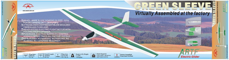 The Green Sleeve is a ready made slope soaring glider ideal for flyers with some experience. The fuselage is streamlined, lightweight and blow-moulded. It comes with an electric motor already fitted, and a folding propeller and spinner. The pushrods, control surfaces, control horns and servo trays are all factory fitted! This model is suitable for 4 channel R/C.