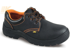 Low lace up safety shoes in black embossed action leather,breathable and wearable Nylon mesh lining,preformed removable and antibacterial mesh/EVA insock,injected dual density polyurethane sole,with energy absorbing heels, antislip,fuel oil and acid resistance,steel toe 200J shock and crush resistance,steel plate 1100N puncture proof,antistatic.