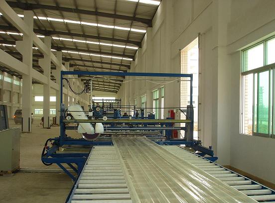 This is a complete continuous corrugated/flat FRP sheet production line specially for manufacturing clear or color high light transmission FRP sheet and gel coat flat FRP. This production line adopts automatic charging, batching and automatic temperature control systems as well as automatic cutting system for cutting in length and width. The hauling speed is step-less variable drive. Those technologies make the production line to be of features such as high efficient productivity, automatic control, advanced processing technology and easy operation etc.