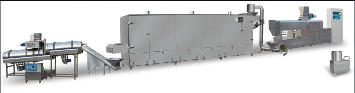 pet-food processing Line is used to produce the food with novel shape, particular taste and color. Scientific nutrition combination catch up the trend the market. With simple operation, accurate parameter control, the products can be finished in the stipulated temperature, pressure, humidity and time. Owing to the reasonable design, special materials, the stability, repairs can be garanteed and ensured. The various shape and taste must meet the different requirements of the pet tood. This line is consist of mixter, double-screw extruder, air conveyor, dryer and coating machine.