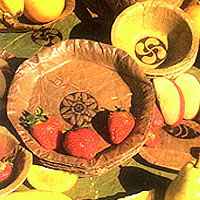 Leaves hygienically cleaned, herbally treated, and woven together with natural fibres are designed as plates and bowls, placement mats and table covers, for easy use at home, parties, picnics and are bio-degradable and compostable