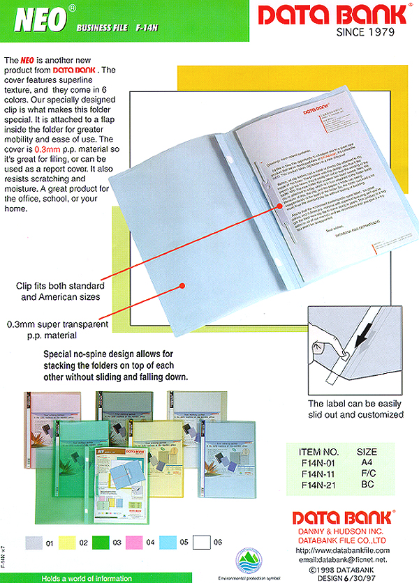 The NEO is another new product from DATA BANK. The cover features superline texture, and they come in 6 colors. Our specially designed clip is what makes this folder special. It is attached to a flap inside the folder for greater mobility and ease of use. The cover is 0.3mm p.p. material so it's great for filing, or can be used as a report cover. It also resists scratching and moisture. A great product for the office, school, or your home.