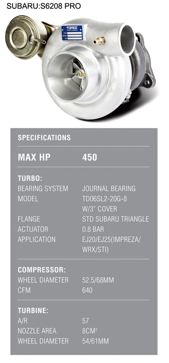 The ZAGE S6208 PRO presents next generation performance of the S6208 by replacing a new compressor housing. The S6208 PRO presents a small A/R and a lower temperature to make this turbocharger much more stable. It will enlarge over 450 HP on the base of 1.2 Bar. This bolt on turbocharger makes a premier choice for SUBARU owners who demand exceptional horsepower.